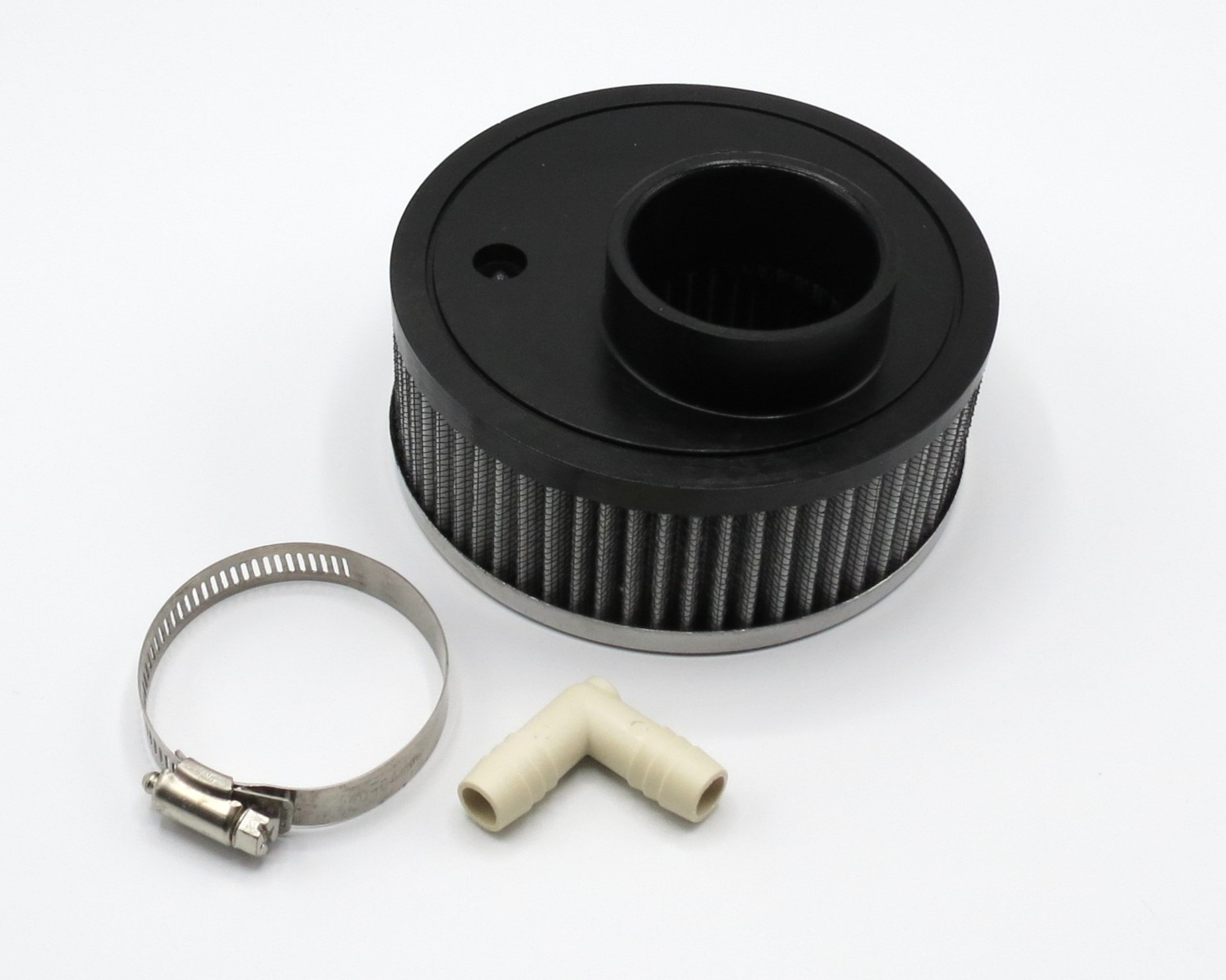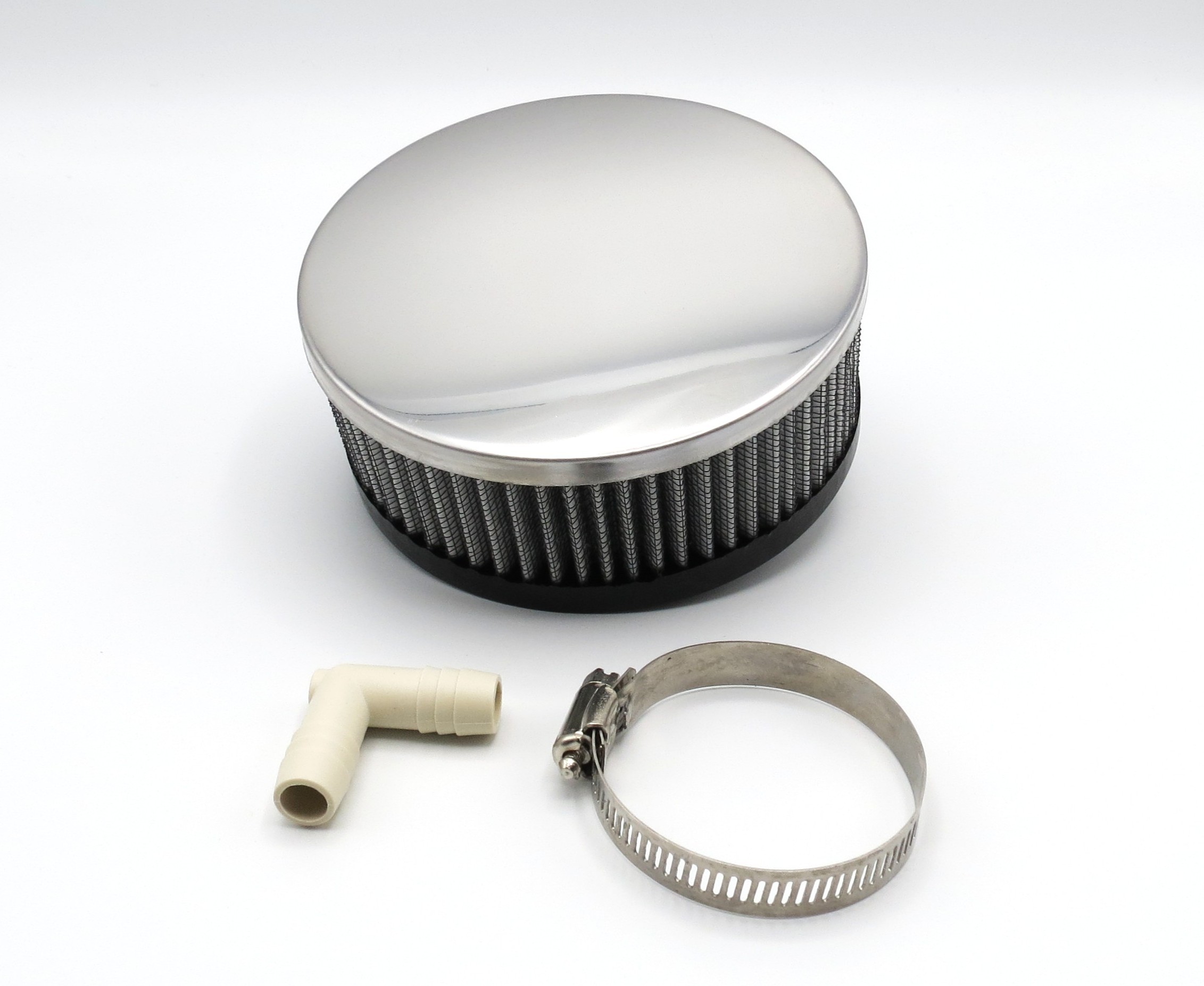 Chrome plated. Clamps on carburetor neck, needs no braces, includes nipple connector for hose to valve cover. Foam filter traps dirt, allows free air to flow for better gas mileage.